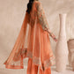 A coral quartz gown style with timeless dazzles on silver work, featuring a modern taupe top border and paired with wide bottoms, exudes sophistication and charm. Completing the ensemble with a four-sided net dupatta adds an extra layer of elegance. It's a perfect combination of contemporary style and classic glamour!